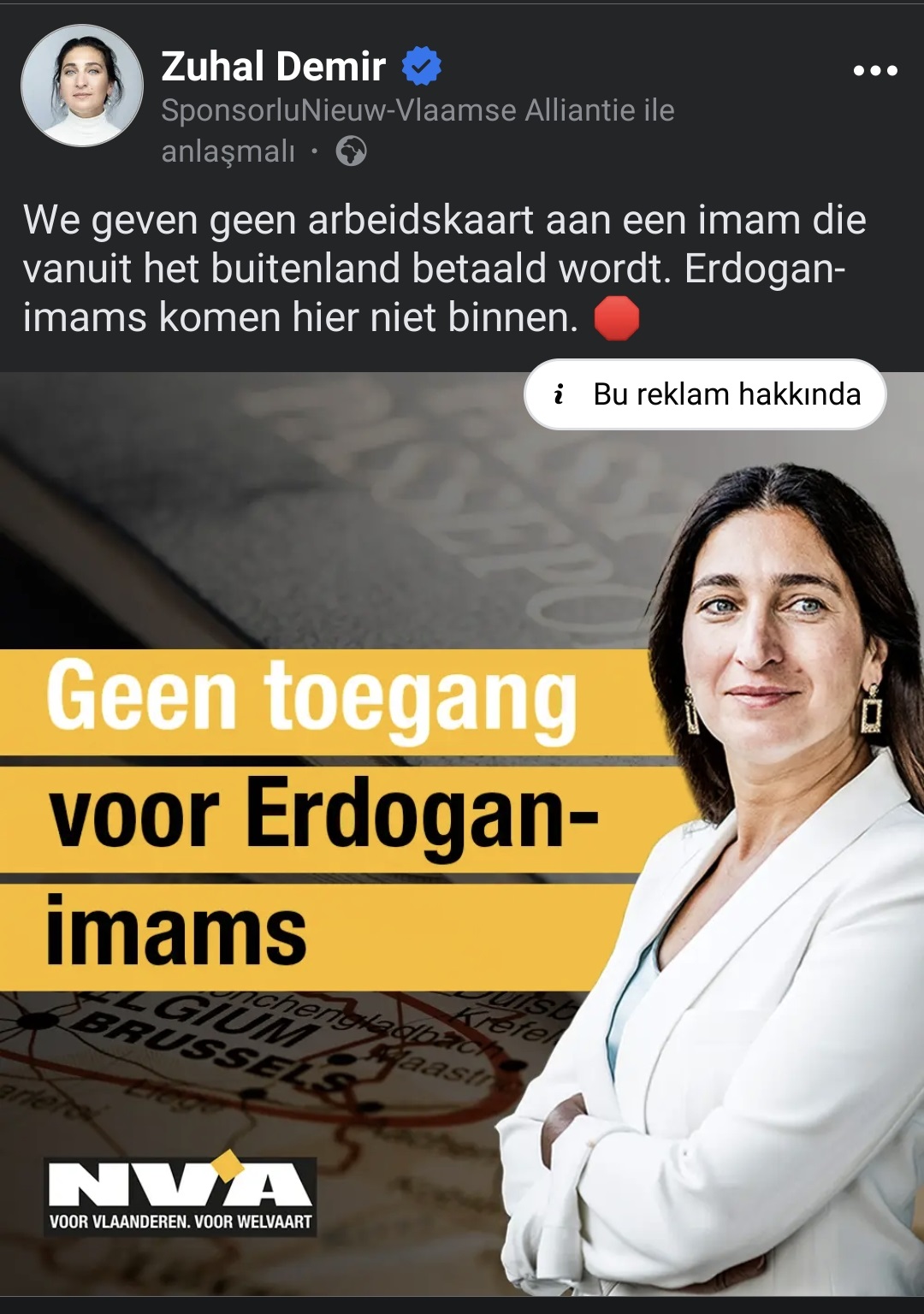 Belçika’da Yeni Flaman İttifakı’na bağlı Flaman olmayan Flaman milliyetçisi Zuhal Demir’in sosyal medyada verdiği ücretli reklam kampanyasında, Türkiye kökenli imamlar ve İslam dini doğrudan hedef alındı. Facebook üzerinden yayımlanan reklamda, Erdoğan üzerinden yapılan ifadeler ile cami görevlileri ve din adamlarına sert mesajlar verildi.