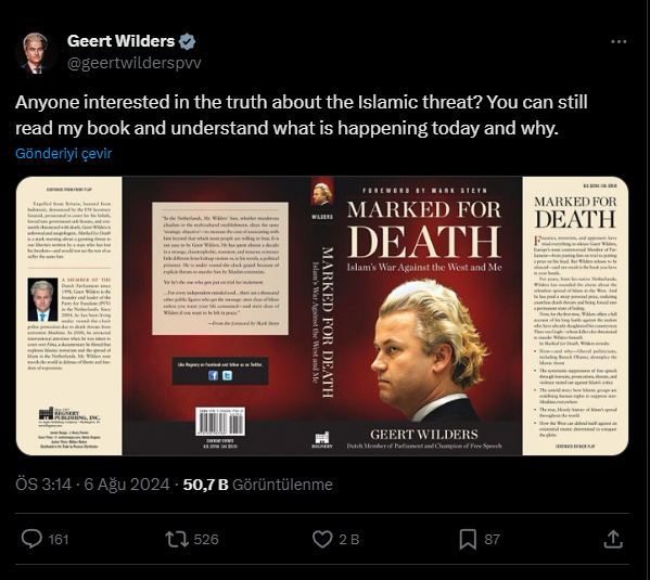 Wilders, “Marked for Death: Islam’s War Against the West and Me” adlı kitabını tanıtan paylaşımıyla, zaten gergin olan toplumu daha da kutuplaştırmakla suçlanıyor.